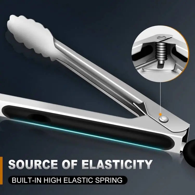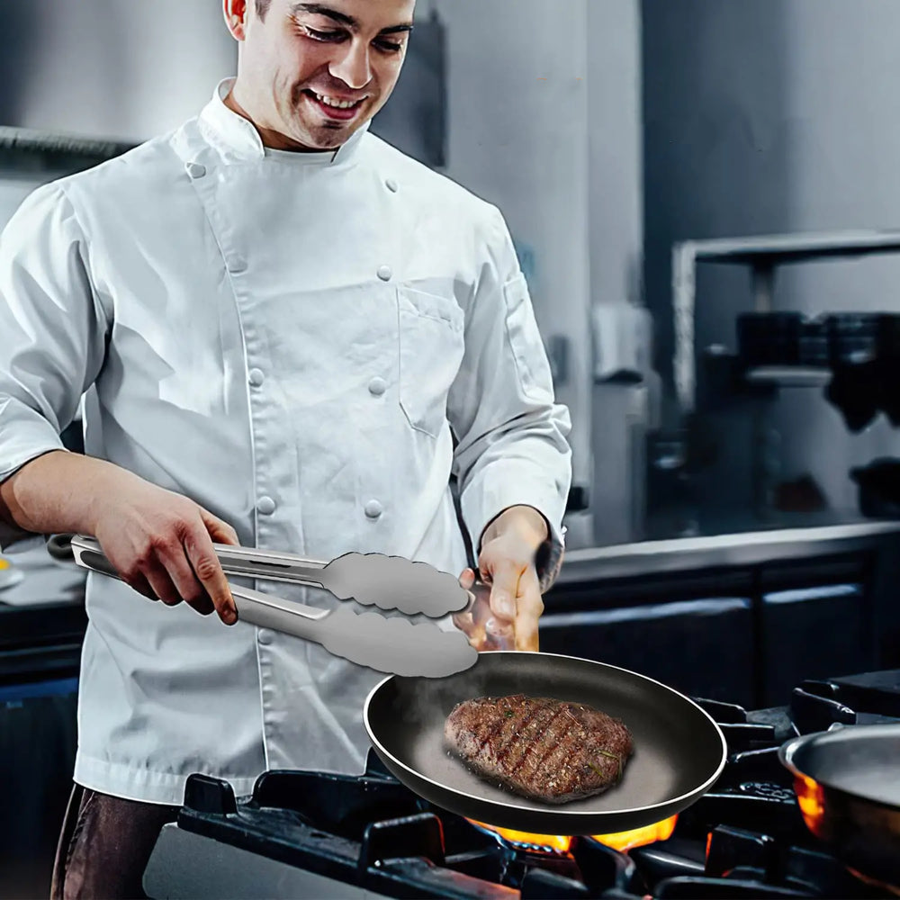 Made from food-grade 1mm thick stainless steel, these tongs withstand temperatures up to 600°F. Perfect for grilling, frying, boiling, and baking. Easy to clean by hand or dishwasher.