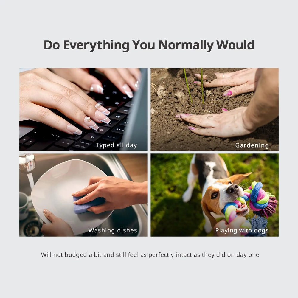 Remove easily without acetone or drills! Simply soak in warm water for 10 minutes for gentle peel-off. Your natural nails stay healthy and undamaged.