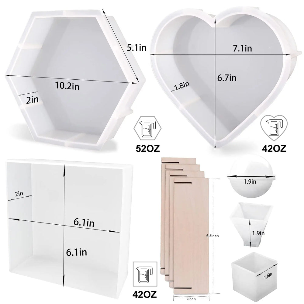 This set includes 3 large silicone molds (hexagon, heart, and square) and 3 small accent molds (sphere, cube, and pyramid). Perfect for creating custom resin bookends, paperweights, and decorative art with flowers, glitter, or keepsakes.