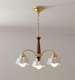 Rare midcentury chandelier in brass, wood, and frosted opaline ceramics. This chandelier is made with a high sense of quality and has great details. It features five light sources, hidden by opaline ceramics shades. The brass arms are connected to a wooden centerpiece.